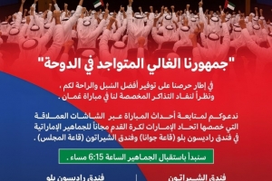 我們邀請(qǐng)您在阿聯(lián)酋足球協(xié)會(huì)為阿聯(lián)酋球迷免費(fèi)提供的位于麗笙酒店(喬安娜廳)和喜來(lái)登酒店(馬吉利斯廳)的巨型屏幕上關(guān)注比賽動(dòng)態(tài)。我們將于18:15(22:15)開(kāi)始接待公眾。”