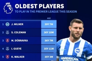 德轉(zhuǎn)列本賽季英超出場最年長球員排行: