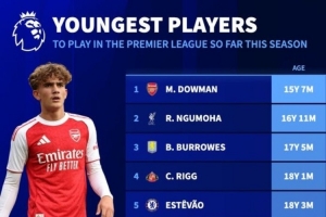 體育資訊9月13日訊 德轉(zhuǎn)列本賽季英超截止目前出場(chǎng)最年輕球員排行,道曼15歲7個(gè)月最年輕,恩古莫哈第二。