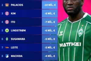 2、帕拉西奧斯(勒沃庫(kù)森):-1000萬(wàn)歐元