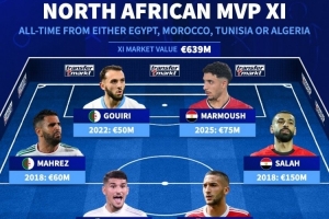 體育資訊10月15日訊 德國(guó)轉(zhuǎn)會(huì)市場(chǎng)列出了北非國(guó)家(埃及、摩洛哥、突尼斯、阿爾及利亞)球員歷史身價(jià)最高陣容,薩拉赫、馬赫雷斯、馬爾穆什在列。