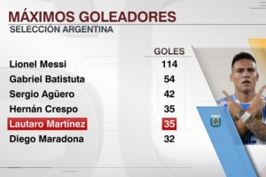 體育資訊10月15日訊 勞塔羅在阿根廷隊(duì)大勝波多黎各的友誼賽中梅開(kāi)二度,根據(jù)ESPN統(tǒng)計(jì),勞塔羅阿根廷隊(duì)進(jìn)球數(shù)追平克雷斯波,并列隊(duì)史第四。