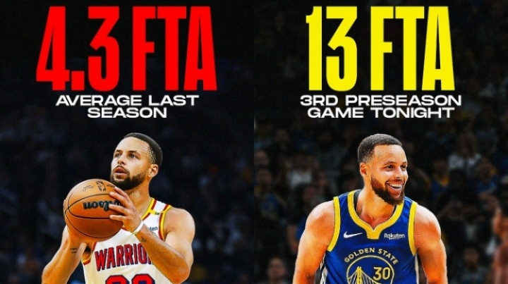 對(duì)陣開拓者的第三場(chǎng)季前賽中,庫里獲得了13次罰球機(jī)會(huì)。盡管他上賽季場(chǎng)均突破次數(shù)位列聯(lián)盟前15,但其場(chǎng)均罰球數(shù)僅為4.3次。