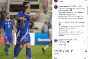 麥卡利斯特社媒曬出比賽照片,并寫道:“以兩粒進球結(jié)束了積極的國際比賽日之旅,與國家隊伙伴們共度數(shù)日時光總是令人感到愉快。”
