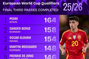 體育資訊10月15日訊 Squawka列出了歐洲世預(yù)賽進(jìn)攻三區(qū)成功傳球排名,西班牙中場佩德里居首。