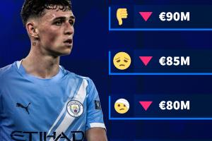 體育資訊10月16日訊 明日德轉(zhuǎn)將更新英超球員身價,德轉(zhuǎn)官方社媒今日發(fā)圖預(yù)熱福登身價變化,球員身價必定下跌,最多跌至7500萬。