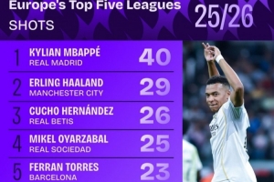 體育資訊10月17日訊 Squawka統(tǒng)計(jì)了本賽季到目前為止歐洲五大聯(lián)賽球員射門次數(shù)排行,皇馬前鋒姆巴佩40次射門排名第一,哈蘭德29次第二。
