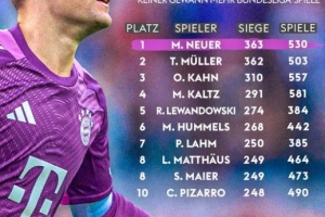 體育資訊10月19日訊 德甲第7輪比賽,拜仁在安聯(lián)球場(chǎng)以2-1的比分力克多特笑傲國(guó)家德比。本場(chǎng)比賽,拜仁門(mén)將諾伊爾迎來(lái)自己第530場(chǎng)德甲比賽,而他也取得了第363場(chǎng)勝利,這讓他超越穆勒成為德甲勝場(chǎng)數(shù)最多球員。
