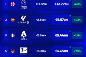 體育資訊10月20日訊 德轉(zhuǎn)此前更新了足壇球員身價(jià),并盤點(diǎn)了五大聯(lián)賽球隊(duì)總身價(jià)榜,其中英超遙遙領(lǐng)先,以下為具體情況: