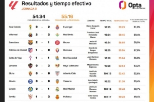 體育資訊10月21日訊 OPTA統(tǒng)計(jì)了西甲第九輪各場(chǎng)比賽的有效時(shí)間,沒(méi)有任何一場(chǎng)比賽的有效時(shí)間超過(guò)60分鐘。