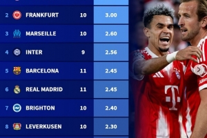 體育資訊10月21日訊 德轉(zhuǎn)盤點了本賽季五大聯(lián)賽球隊目前場均進球最多榜單(各項賽事),其中拜仁高居榜首,具體如下: