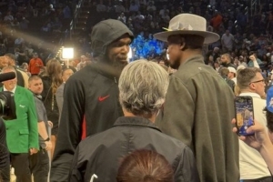 球隊(duì)名宿伊巴卡也來(lái)到現(xiàn)場(chǎng)見證這一時(shí)刻,賽前他和前隊(duì)友杜蘭特寒暄。