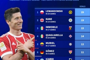 體育資訊9月14日訊 德國(guó)轉(zhuǎn)會(huì)市場(chǎng)統(tǒng)計(jì)了本世紀(jì)五大聯(lián)賽球員對(duì)陣?yán)蠔|家的進(jìn)球數(shù)量,并列出榜單,萊萬(wàn)對(duì)陣多特打進(jìn)29球居首,凱恩對(duì)陣萊斯特城攻入19球次席。