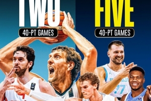 據(jù)Clutchpoints統(tǒng)計(jì),1997年到2017年的10屆歐錦賽,僅出現(xiàn)過兩次40+,23歲的諾維茨基在2001年歐錦賽銅牌戰(zhàn)中爆砍43分,35歲的保羅-加索爾在2015年歐錦賽半決賽中砍下40分。最近兩屆歐錦賽(2022和2025),已經(jīng)出現(xiàn)5次40+,東契奇2022年對陣法國砍47分,今年對陣意大利砍42分,字母哥2022年對陣烏克蘭砍下41分,馬爾卡寧2022年對陣克羅地亞砍下43分,今年對陣英國砍43分。