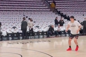 賽前,楊瀚森身穿中國紅戰(zhàn)靴進(jìn)行投籃熱身。