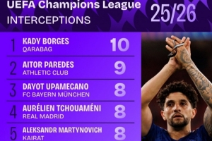 體育資訊10月23日訊 歐冠第3輪已經(jīng)完賽,數(shù)據(jù)機(jī)構(gòu)squakwa統(tǒng)計(jì)了本賽季至今的歐冠攔截情況,