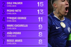 體育資訊10月23日訊 數(shù)據(jù)網(wǎng)站Squawka盤(pán)點(diǎn)了2025年切爾西球員各項(xiàng)賽事參與進(jìn)球榜單,具體如下(進(jìn)球+助攻):