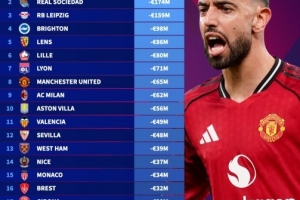 以下為今年五大聯(lián)賽球隊身價跌幅榜top20: