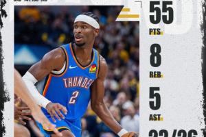 本場(chǎng)比賽,雷霆當(dāng)家球星亞歷山大一展雙MVP風(fēng)采,攻防俱佳,戰(zhàn)力十足,末節(jié)&加時(shí)頻頻取分,砍下生涯新高的55分&罰球數(shù)生涯新高26記,同時(shí)成為本賽季全聯(lián)盟首位50分先生!