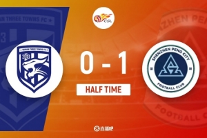 傷停補(bǔ)時(shí)5分鐘。上半場(chǎng)比賽結(jié)束,武漢三鎮(zhèn)0-1深圳新鵬城。