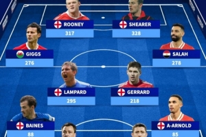 中場(chǎng):吉格斯(276球)、蘭帕德(295球)、杰拉德(218球)、薩拉赫(278球)