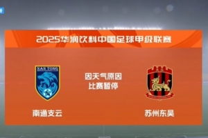 南通支云本輪中甲對陣蘇州東吳,比賽進行到60多鐘的時候因天氣原因暫停,據(jù)南通支云官方表示,因雷暴天氣,比賽暫停。目前,場上比分仍是0-0平。