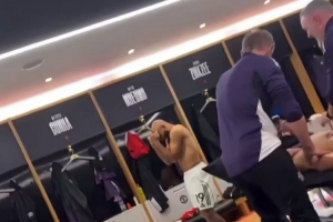 比賽結(jié)束之后姆伯莫、阿瑪?shù)略诟率依锾?,慶祝球隊取勝。