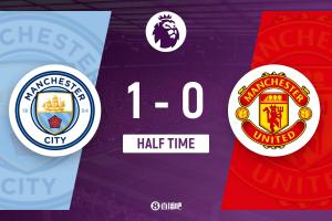 上半場補(bǔ)時1分鐘,曼城1-0曼聯(lián)。