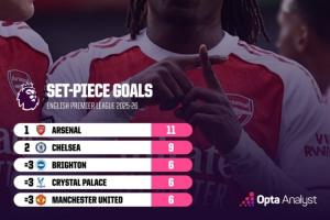 本賽季英超球隊(duì)通過定位球破門球隊(duì)排行榜↓
