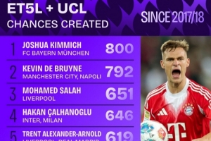 體育資訊9月7日訊 數(shù)據(jù)機(jī)構(gòu)squakwa統(tǒng)計(jì)了17-18賽季以來五大聯(lián)賽+歐冠的創(chuàng)造機(jī)會(huì)情況,基米希力壓德布勞內(nèi)居首。