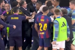 體育資訊10月27日訊 據(jù)西媒eldesmarque報(bào)道,國(guó)家德比比賽臨近結(jié)束時(shí),巴薩中場(chǎng)佩德里吃到第二張黃牌被罰下場(chǎng),這一事件成為了“導(dǎo)火索”,直接引發(fā)了雙方替補(bǔ)席人員的“大規(guī)?;鞈?zhàn)”。場(chǎng)面一度失控,以至于安保不得不迅速介入,強(qiáng)行將兩隊(duì)替補(bǔ)席分隔開(kāi)。