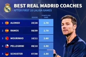 體育資訊10月27日訊 皇馬在本輪西甲焦點(diǎn)戰(zhàn)2-1力克巴薩,阿隆索帶隊(duì)延續(xù)了出色的戰(zhàn)績(jī)。德轉(zhuǎn)數(shù)據(jù)統(tǒng)計(jì)顯示,阿隆索執(zhí)教皇馬的前10輪西甲拿分并列歷史第一。