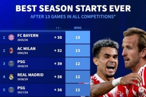德轉列五大聯(lián)賽球隊賽季各項賽事前13場最佳開局: