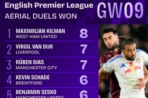 英超第9輪贏得空中對(duì)抗次數(shù)榜: