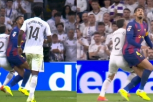 弗里克的球隊(duì)整場(chǎng)控球占優(yōu),但踢法很容易預(yù)測(cè)、缺乏銳度。只有費(fèi)爾明和拉什福德偶爾能突破皇馬防線。佩德里被重點(diǎn)盯防,亞馬爾無(wú)法正面拿球,費(fèi)蘭觸球機(jī)會(huì)少且很難獲得舒服的射門位置,全場(chǎng)僅兩次向庫(kù)爾圖瓦射門。上半場(chǎng)最佳進(jìn)攻是費(fèi)爾明的進(jìn)球,佩德里斷球后迅速轉(zhuǎn)化為絕對(duì)機(jī)會(huì)。稍后,費(fèi)爾明頭球攻門,又被赫伊森在門線救險(xiǎn)。