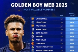 體育資訊10月29日訊 金童獎在本月已經公布了候選名單,《轉會市場》也統(tǒng)計了今年候選者的身價情況,亞馬爾無懸念居首。