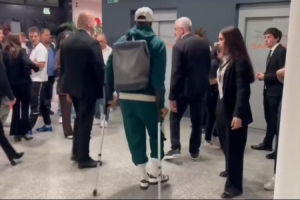 在比賽結(jié)束后,有記者拍到邁尼昂在工作人員的陪同下拄拐離開圣西羅球場(chǎng),看上去傷勢(shì)并不樂觀。