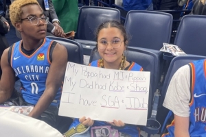 這位雷霆球迷手舉手寫牌,上面寫道:“我的爺爺有喬丹和皮蓬,我的爸爸有科比和奧尼爾,而我有亞歷山大和杰倫-威廉姆斯?!?/p>