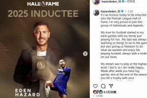 體育資訊10月29日訊 英超官方宣布,切爾西名宿阿扎爾入選英超名人堂。阿扎爾更新社媒,談到自己得獎的興奮之情。