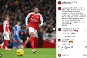 安努斯寫道:“多么美妙的夜晚。為阿森納首發(fā)是夢想成真,我和家人都為我為這家了不起的俱樂部完成正式首秀而感到自豪。感謝上帝賜予我的這個(gè)機(jī)會(huì),永遠(yuǎn)感激這次機(jī)遇,并為成功晉級下一輪感到開心。??”