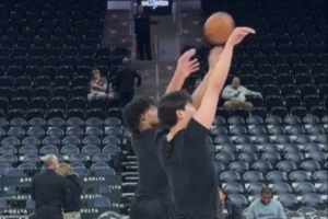 賽前,楊瀚森和隊(duì)友夏普一起進(jìn)行三分投籃熱身。