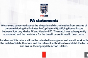 Sporting Khalsa隨后也發(fā)布了一份聲明,稱在對陣Hereford的足總杯比賽中,下半場發(fā)生了針對其守門員Ravan Constable的種族歧視言論。