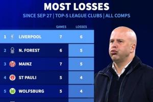 體育資訊10月30日訊 利物浦0-3不敵水晶宮,各項(xiàng)賽事僅7場(chǎng)比賽1勝6負(fù),數(shù)據(jù)統(tǒng)計(jì)顯示,利物浦是同一時(shí)期五大聯(lián)賽所有球隊(duì)中輸球場(chǎng)次最多的。