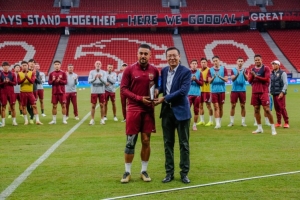 今天的官方訓(xùn)練開始前,俱樂(lè)部為兩位球員舉行頒獎(jiǎng)儀式。俱樂(lè)部總經(jīng)理沙良昌為萊昂納多頒發(fā)第25輪最佳球員獎(jiǎng)杯,為李帥贈(zèng)送百場(chǎng)紀(jì)念球衣。