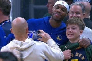 賽前發(fā)生有趣一幕,巴特勒不敢相信場(chǎng)邊一個(gè)小孩兒竟然穿著希爾德的7號(hào)球衣,希爾德則抱著小孩兒搶著與后者合影。