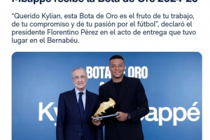 在這里,你正穿著你如此渴望的白色球衣,書寫著你自己的歷史。我們的球迷崇拜你,并將在每一次挑戰(zhàn)中陪伴你。親愛的姆巴佩,這座金靴獎(jiǎng)對(duì)你來說是繼續(xù)贏下去、繼續(xù)為皇家馬德里的偉大歷史做出貢獻(xiàn)的又一動(dòng)力。