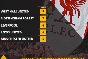 根據(jù)OPTA的數(shù)據(jù)統(tǒng)計,本賽季英超中僅諾丁漢森林(9球)和西漢姆聯(lián)(7球)比利物浦(6球)在定位球方面丟球更多,而諾丁漢森林和西漢姆聯(lián)均身處降級區(qū)。另外,利茲聯(lián)在定位球丟球方面和利物浦同樣多,曼聯(lián)則丟了5球。