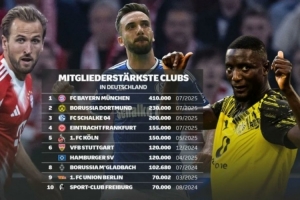 德國俱樂部注冊會員數(shù)量榜: