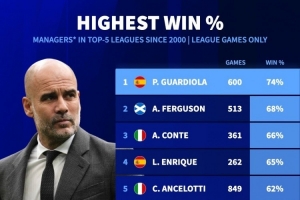 體育資訊9月15日訊 德國轉(zhuǎn)會(huì)市場(chǎng)統(tǒng)計(jì)了本世紀(jì)五大聯(lián)賽教練的聯(lián)賽勝率,并列出榜單,瓜迪奧拉執(zhí)教600場(chǎng),取勝446場(chǎng),勝率74%居首。