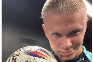 哈蘭德社媒曬出隊(duì)友簽名的比賽用球,并配上五指山的表情符號,慶祝打進(jìn)5球并取勝。